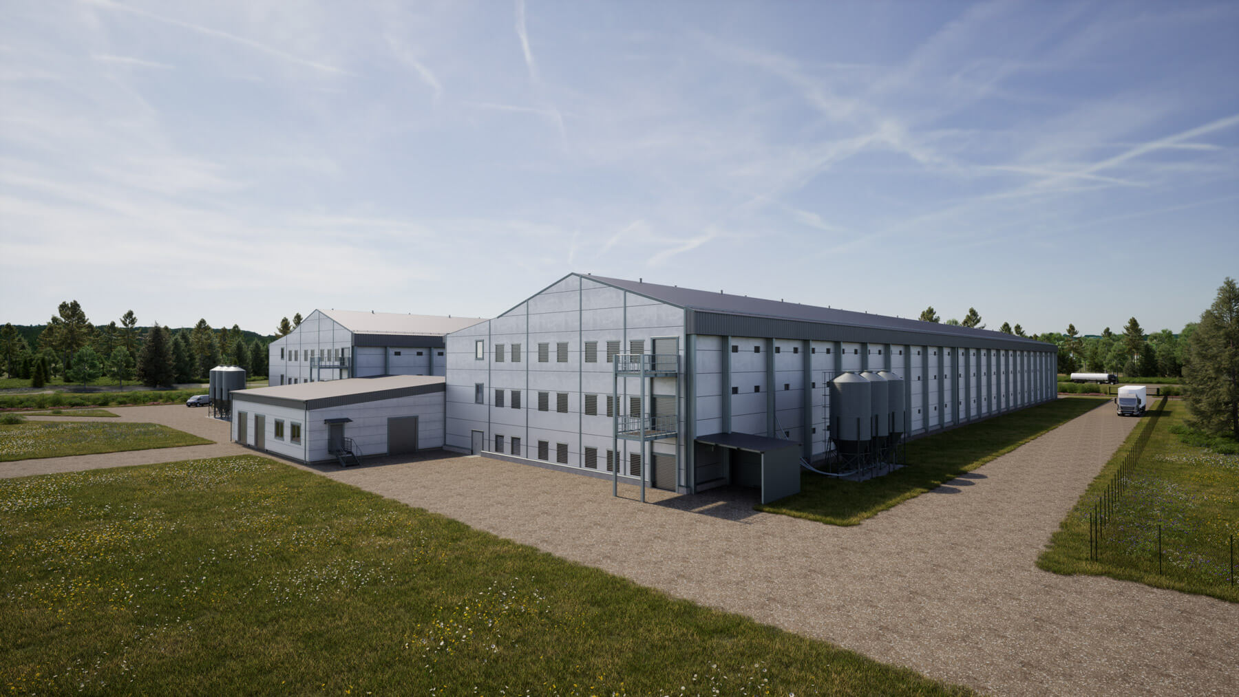 The industrial chicken house facility development project commissioned by LIT EGG UAB consists of two chicken houses with a total area of 17,000 m2, with the capacity to accommodate up to 300,000 birds. Chicken houses are joined by a shared sorting unit. This solution enables high production quality, as well as the fast and efficient collection and packaging of eggs. The facility is equipped with an automated system for feeding the birds, and for collecting their eggs and manure. The high level of automation will not only ensure consistent production of eggs, but will also make it possible to use production waste for biogas and valuable organic fertiliser. The project is designed in compliance with high quality and technical standards ensuring an efficient production process and the welfare of the birds.